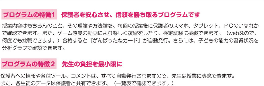 家庭でも復習できる機能があり、ご家庭と一体となり、幼児期に必要な楽しみながら、考える力を育成できていることを実感しております。